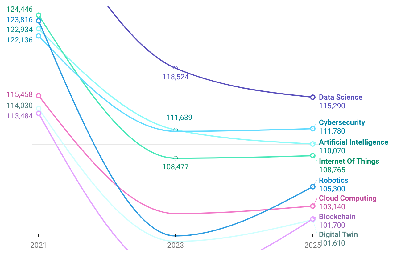 Data science, cybersecurity and AI top the chart for 2025, with more than 110 thousand job postings requiring relevant skills.